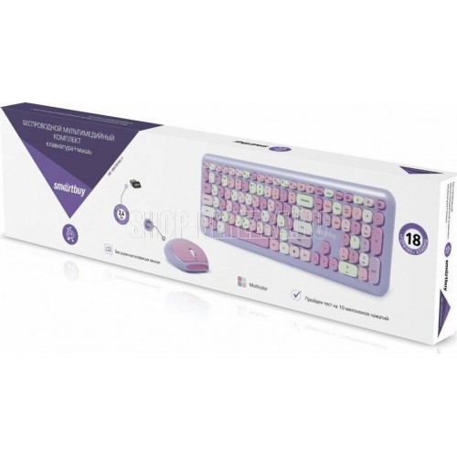 Цвет мыши: фиолетовыйТип сенсора: ОптическийКоличество кнопок мыши: 3Радиус действия: до 10 мПитание мыши: 1 батарейка ААИнтерфейс подключения: USBЦвет клавиатуры: белыйПитание клавиатуры: 1 батарейка ААА