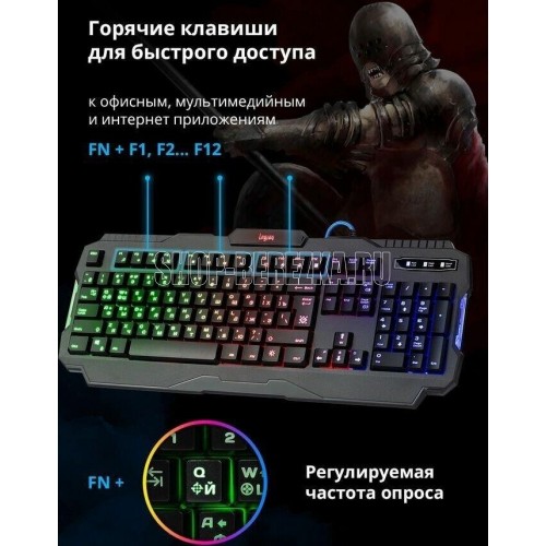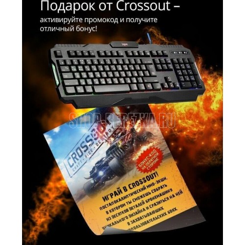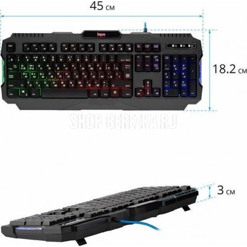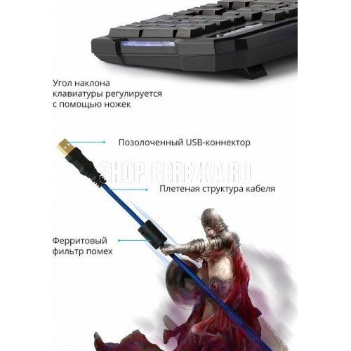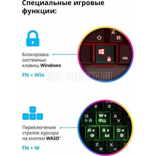 Клавиатура игровая, проводная, интерфейс подключения - USB, специальный игровые функции - блокировка системных клавиш Windows и переключение стрелок курсора на кнопки WASD*, радужная подсветка, металлическое дно, ферритовый фильтр помех, влагоустойчивая конструкция, длина кабеля - 1,5 м.