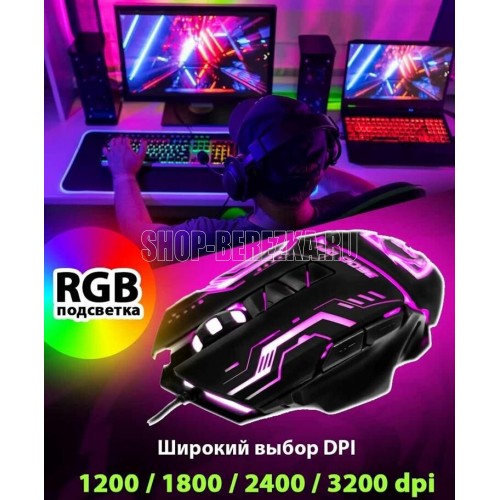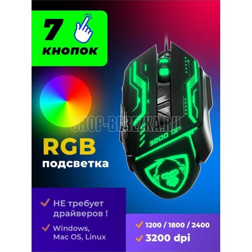 Мышь проводная, оптическая, интерфейс USB, количество кнопок - 7, колесо прокрутки, изменяемое разрешение 1200 / 1800 / 2400 / 3200 dpi, длина кабеля - 1,5 м.