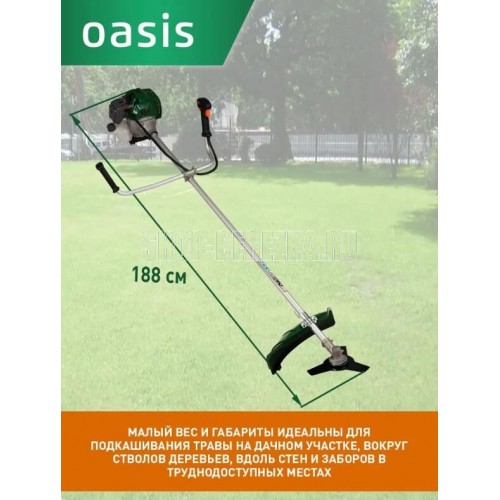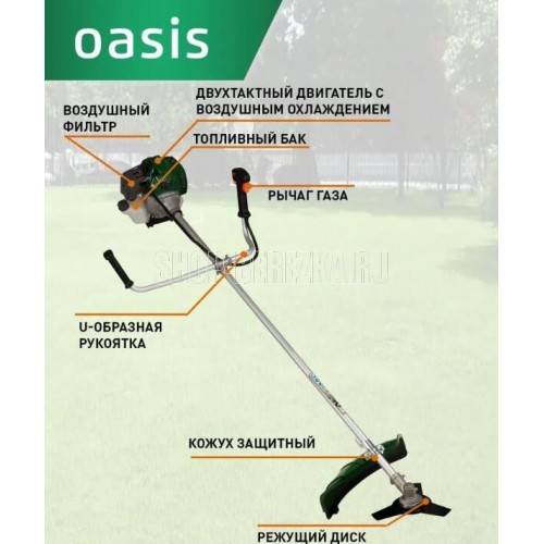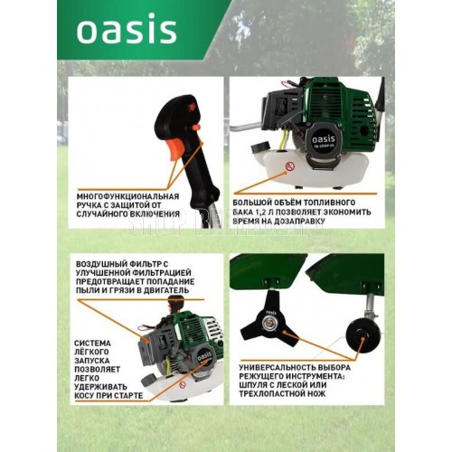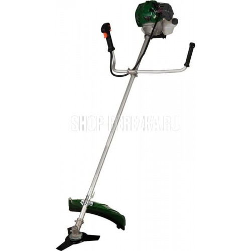 Мощность 2500/3,3 Вт/л.с; Объем двигателя 51,7; средний расход топлива 700 г/кВт.ч, скорость вращения шпинделя 7500 об.мин, объем топливного бака 1.2л, тип зажигания - электронное, тип бензина (рекомендованный) - 92, ширина кошения кордом 430мм, ширина кошения ножом 255мм, уровень шума 96 дБ, тип штанги - Цельная, тип рукоятки - Велосипедная, Вес 7кг.