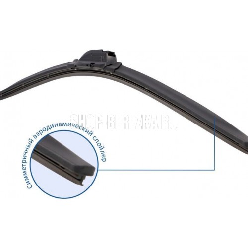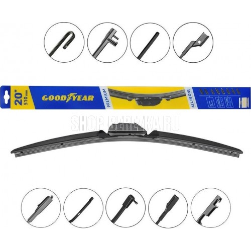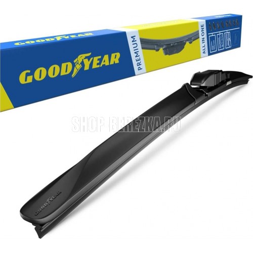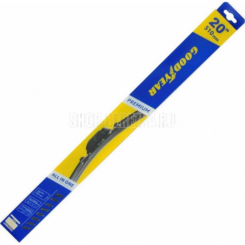 Уникальная система крепления адаптеров Clip Adapters (8 адаптеров на 11 видов крепления) позволяет использовать GOODYEAR PREMIUM на 99,8% всех моделей легковых автомобилей, в том числе с правым рулём Симметричный спойлер уникален в своём классе и выполнен из термопластичного эластомера, что делает его устойчивым к деформациям. Выполнен в виде литой конструкции и не имеет боковых заглушек, что значительно снижает обмерзание краёв щётки. Конструкция крепления лезвия имеет не только металлическую пластину на которой крепится лезвие, но и две дополнительные направляющие из нержавеющей стали, которые обеспечивают более прочное крепление резинового лезвия. Резиновое лезвие класса Triple A (ААА). Лезвие проходит процедуру полировки удаление шероховатостей поверхности.