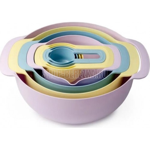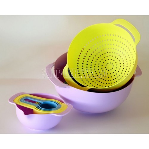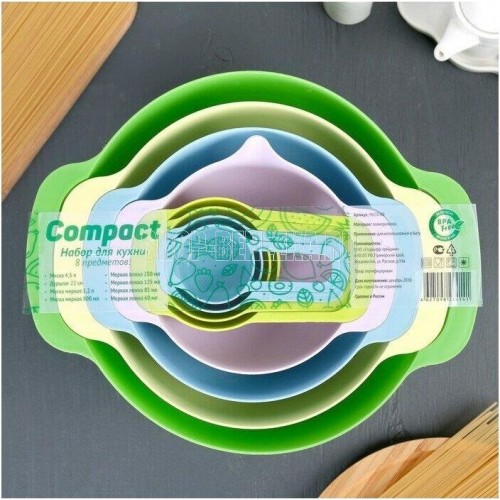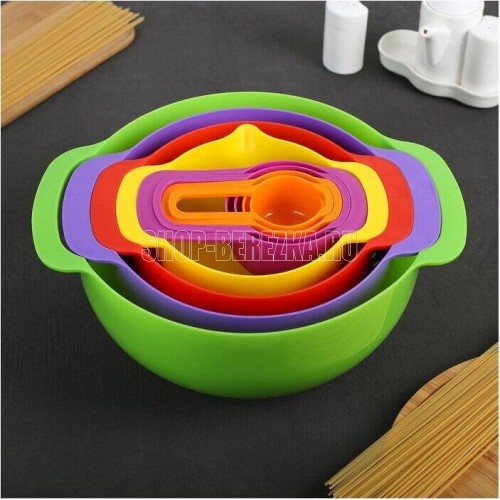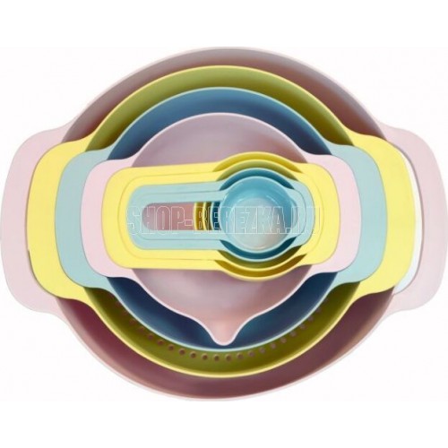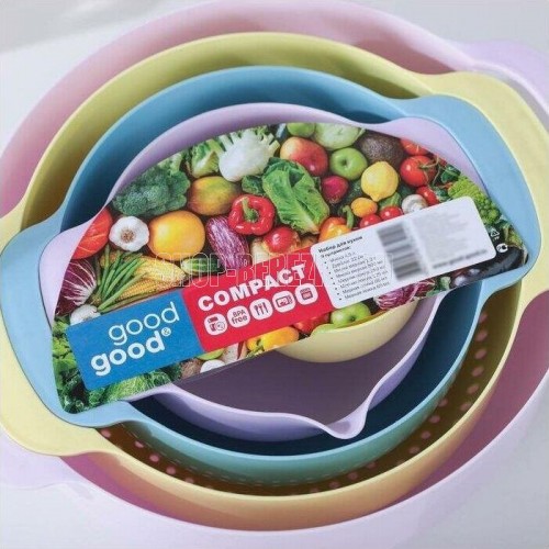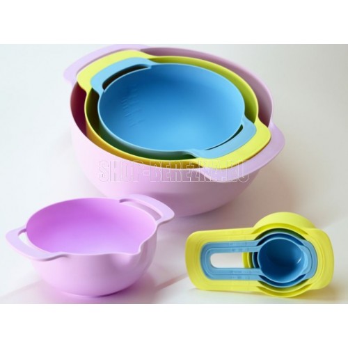 Набор мисок из 8 предметов. Набор Мисок Good&Good станет важным дополнением вашей кухни. Набор для кухни способен помочь вам точно отмерять необходимое количество муки, специй и других ингредиентов. Миска изготовлена из качественного полипропилена, который не деформируется и не выделяет вредные вещества. Стоит отметить, что все предметы набор емкостей вставляются друг в друга для компактного хранения. Салатник легко мыть, в т.ч. в посудомоечной машине. Температурный режим: +90 -40. Эргономичная ручка чаши, помогает удобно держать миску во время взбивания, а сливной носик удобен для переливания. Набор Посуды состоит из 8 пластиковых приборов: ** миска для смешивания 4,5 л; чаша с мерной шкалой 1,2 л; миска с носиком 0,8л; дуршлаг диаметром 22 см; мерные ложки в наборе 250 мл, 125 мл, 80 мл и 60 мл.