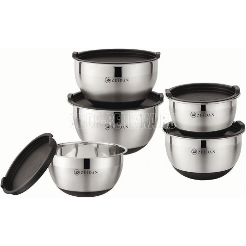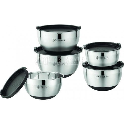 Набор мисок ZEIDAN Z-11136, 10 предметов , Набор мисок, 10 предм., высококачественная нержавеющая сталь 0.5 мм, (5 МИСОК С КРЫШКАМИ: 1,2 Л (d16 см), 1,5 Л (d18 см), 2,5 Л (d20 см), 3,0 Л (d22см), 4,2 Л (d24 см), крышки – высококачественный пищевой пластик, нескользящее силиконовое дно. Подарочная упаковка.