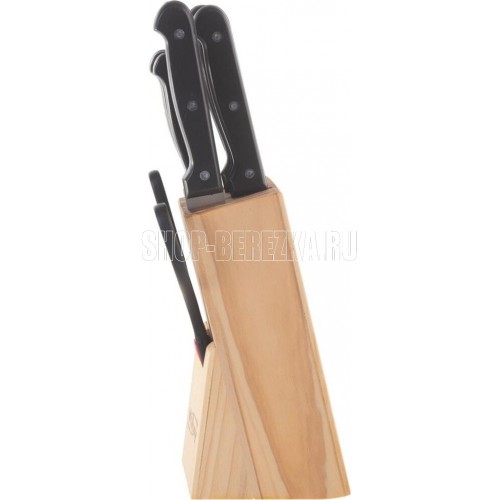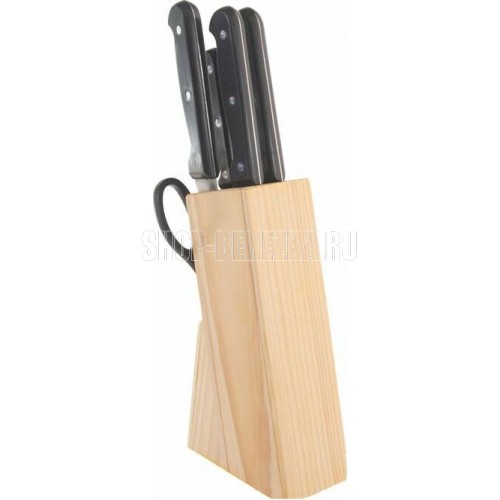 Набор ножей 7 предметов: - нож поварской - нож разделочный большой - нож филейный - нож универсальный - нож для овощей - кухонные ножницы - деревянная подставка Материал: нерж. сталь (3CR13), пластмасса, дерево Не рекомендуется мыть в посудомоечной машине. Упаковка: цветная коробка