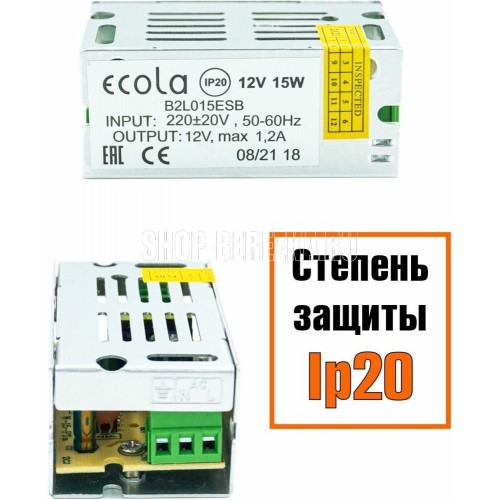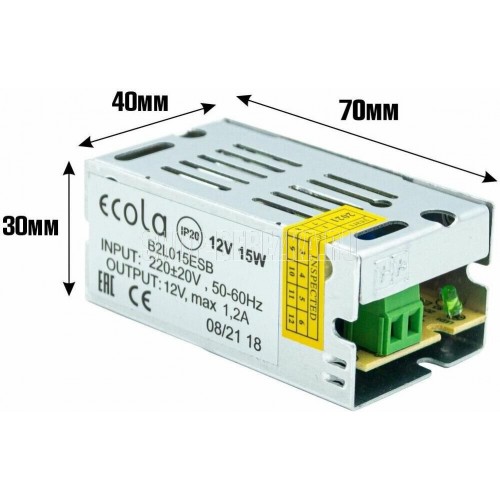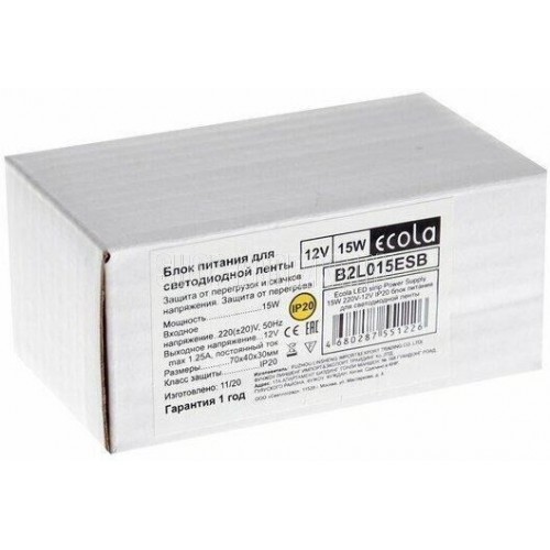 ECOLA LED strip Power Supply 15W 220V-12V IP20 блок питания для светодиодной ленты Степень защиты IP20 Мощность 15W Напряжение входное 220V Напряжение выход 12V
