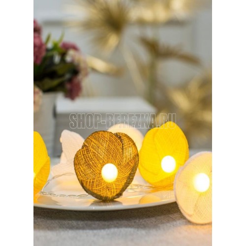 Интерьерная гирлянда "ЦВЕТЫ" KOC_GIR-B110 длиной 1,35+ 0,35м. 10 крупных нежных цветков в желтой гамме придадут Вашему интерьеру воздушный кружевной настрой летнего сада. Вы можете украсить гирляндой любую поверхность: блюдо, полку, изголовье кровати. Фантазируйте и оформляйте гирляндой жилые помещения, фотозону, магазин и т.д. Желтая гамма состоит из бежевых, желтых и коричновых цветков. Работает от батареек 2АА, безопасна для детей и животных.