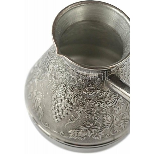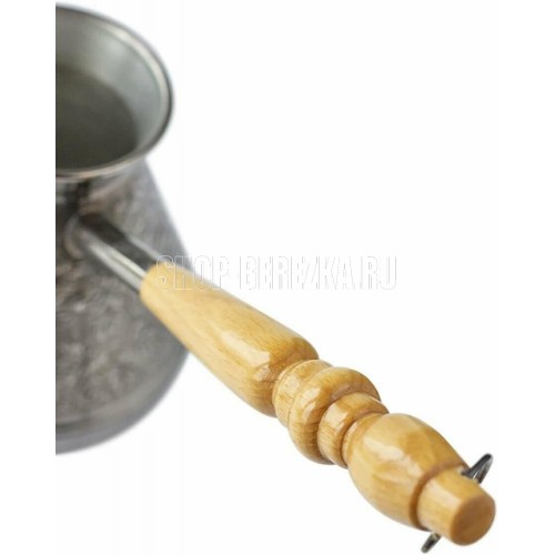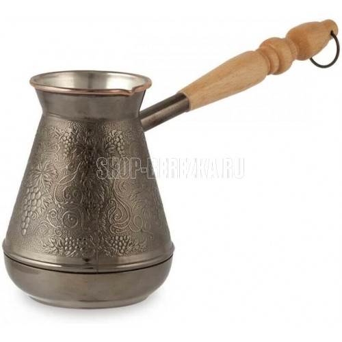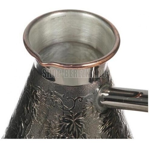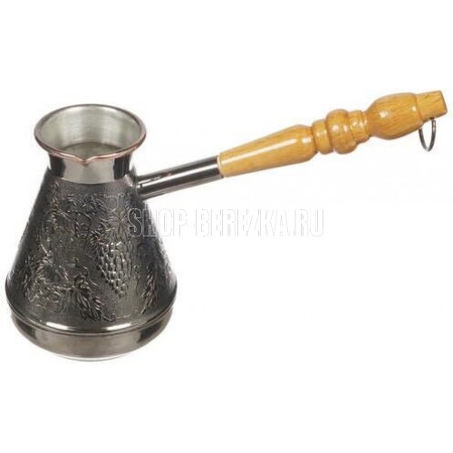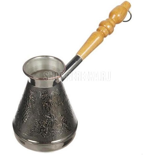 Турка изготовлена из меди, прекрасно подходит для приготовления настоящего кофе на плите. Внешняя поверхность имеет декоративное тиснение, что придает изделию оригинальный внешний вид. Внутренняя сторона покрыта пищевым оловом. Изделие оснащено небольшим носиком и удобной не нагревающейся деревянной ручкой с петелькой для подвешивания. Надежное крепление ручки гарантирует безопасное использование.