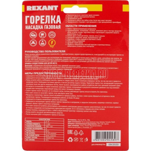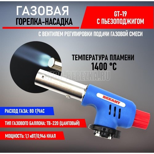 Газовая горелка-насадка, мощность: 1,1кВт 0,96 ккал , температура пламени: 1400 С (макс.), расход газа: 80 гр/ч, тип поджига: встроенный пьезо, материал: медь + нержавеющая сталь + алюминий + сплав цинка + пластик, сфера применения: от плавления и сварки до копчения продуктов, тип газового баллона: ТВ-220 (цанговый).