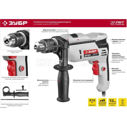 Мощность, Вт 810 Макс. число оборотов холостого хода, об/мин 0-2800 Частота ударов, уд/мин 0-42000 Макс. диаметр сверления (дерево), мм 20 Макс. диаметр сверления (металл), мм 10 Макс. диаметр сверления (бетон), мм 13 Тип патрона клю че вой Диаметр патрона, мм 1.5-13 Посадка патрона, дюйм 1/2 Режимы работы свер ле ни е/ свер ле ние с уда ром Количество скоростей работы 1 Реверс есть Электронная регулировка частоты вращения есть Фиксация кнопки включения есть Ограничитель глубины сверления есть Дополнительная рукоятка есть Диаметр шейки под рукоятку, мм 43 Длина кабеля, м 2