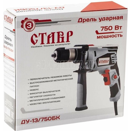 Ставр ДУ-13/750БК (10шт) Дрель ударная 750 Вт, 0-3000 об/мин, 0-40000 уд/мин, патрон 2-13мм двухмуфтовый, быстрозажимной, реверс, регулировка оборотов, шнур питания 3м
