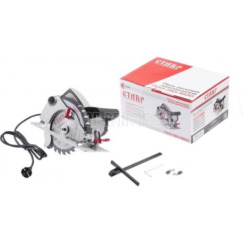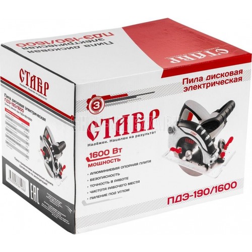 СТАВР ПДЭ-190/1600 Пила дисковая электрическая СТАВР ПДЭ-190/1600 Мощность 1600 Вт, 5000 об/мин. Диаметр диска 190 мм., посадочный диаметр диска 20 мм. Угол пропила до 45 градусов. Максимальная глубина пропила до 63 мм. Длина сетевого кабеля 2 м.