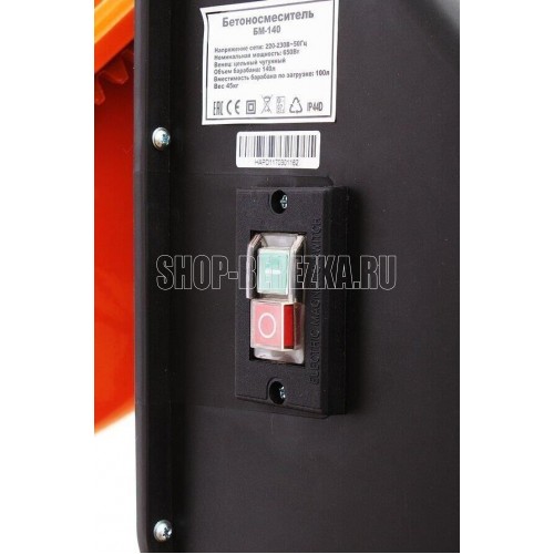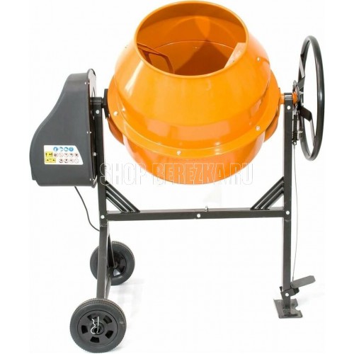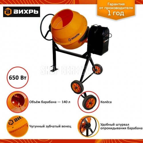 Мощность 650Вт, объем барабана 140л, вместимость барабана по загрузке 100л, диаметр отверстия барабана 375мм, скорость вращения барабана 29,5 об/мин, время приготовления порции смеси 3-7мин, венец чугунный, габариты 770х690х430 мм, вес 48кг.