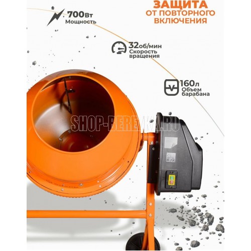 Вес нетто, кг 56,92. Объем барабана, л 160. Напряжение, В 220. Венец чугунный. Тип двигателя электрический. Габариты без упаковки, мм 770х730х520. Мощность (Вт) 650. Количество оборотов барабана, об/мин 29.5. Объем готового раствора, л 110. Диаметр загрузочного отверстия, мм 375. Тип подключения сетевая вилка.