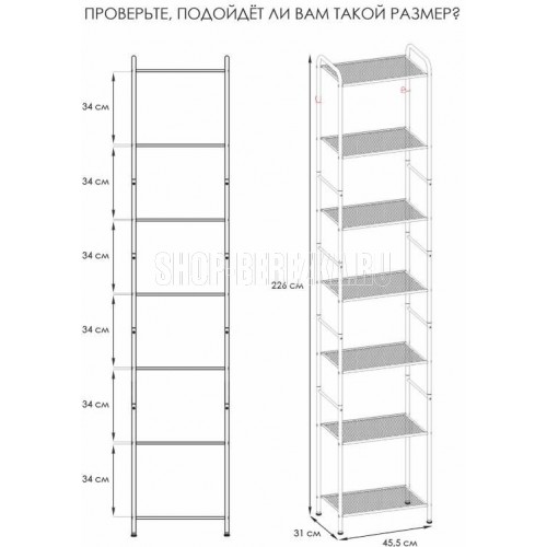Эстетика: современный дизайн в сочетании с разнообразием цветовых решений позволяет выбрать стеллаж, который гармонично впишется в любой интерьер. Преимущества: стильный дизайн, который впишется в любой интерьер; полки выдерживают нагрузку до 8 кг, что позволяет разместить короба, кофры и другие предметы; прочная металлическая конструкция обеспечивает надёжность и долговечность изделия. Штрихкоды: Белый - 4610195635343 Чёрный - 4610195635336 Графит - 4610195636531 Характеристики Назначение Для хранения вещей во внутренних помещениях Материал сталь, порошково-полимерное покрытие, пластик Индивидуальная упаковка 635 х 430 х 95 мм Габариты (Д*Ш*В) 46 х 30,6 х 225,5 см Вес Нетто 7,6 кг Вес Брутто 8,1 кг Объем 1 шт. 0,026 м? Материал упаковки Гофрокороб Страна производитель Россия Гарантия 36 месяцев Общий объем 0,026 м? Количество шт. в 1 м3 38 шт. Максимальная нагрузка, кг До 8 кг на полку Уход Протереть влажной тряпочкой с мыльным средством Температура применения, °C от 0 °C до +30 °C