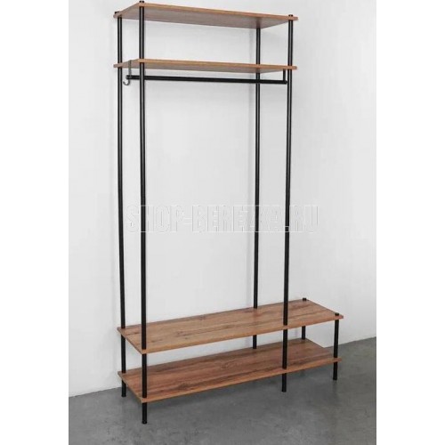 Натуральное дерево нагрузка на 1 полку до 25кг Сталь, полимерное покрытие диаметр трубы 22 пластик - регулируемая опора.Отличия: ? Дополнительный металлический крючок, с одной стороны, вешала ? Сборка производится при помощи оригинальной стальной шпильки, один конец которой вкручивается в лепестковую гайку стойки, затем шпилька проходит в отверстие полки и соединение затягивается путем накручивания второй стойки на шпильку. ? Данный способ сборки, а также декоративные металлические элементы на верхних горизонтальных поверхностях и торцах вешала визуально скрывают все крепежи. ? Расстояние от пола до нижней полки 115 мм. ? Двухсекционная конструкция, позволяющая использовать низкую секцию как сидение,Габариты (Д*Ш*В) — 114,5 х 36.5 х 206.5 см