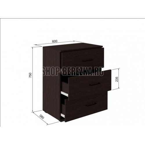Комод 3Я-03 - полезный элемент хранения вещей в спальне, гостиной или прихожей. Вместительная, и в то же время компактная модель выполнена в современном стиле и подходит для разных типов интерьера. В три больших ящика можно сложить необходимую одежду, комплекты постельного белья или игрушки. Материал каркаса: ЛДСП венге цаво Материал фасадов: ЛДСП венге цаво Ручки: пластик Направляющие ящиков: роликовые Ширина 600 Высота 770 Глубина 380 Цвет фасадов Венге Цвет каркасов Венге Материал фасадов ЛДСП Материал каркасов ЛДСП Тип мебели Комод Срок службы (мес.) 120 Гарантия (мес.) 24