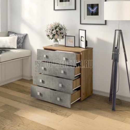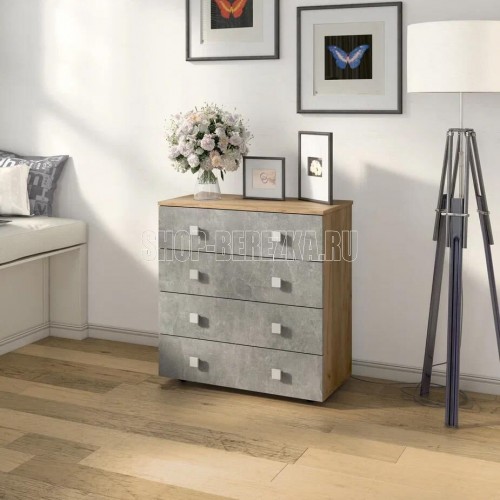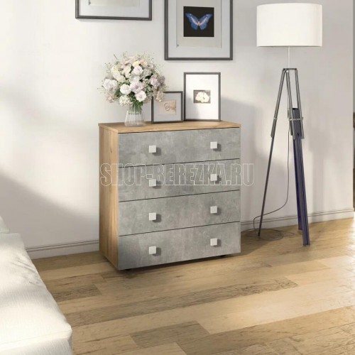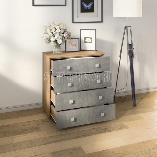 Практичный комод с четырьмя ящиками. Фасады и крышка комода выполнены из ЛДСП, корпус ЛДСП. Направляющие роликовые. Размер 770мм*800мм*394мм