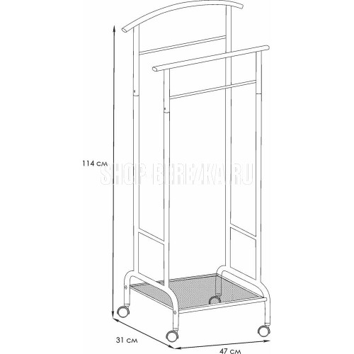 Назначение Для размещения одежды. Материал Сталь, полимерное покрытие, пластик. Габариты (Д*Ш*В) 47х30х114 см. Максимальная нагрузка, кг до 3 кг на плечико.