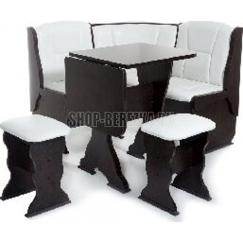 Кухонный уголок Нарцисс позволит оборудовать даже самую маленькую кухню максимально комфортно и удобно «для себя любимого». Все лучшее от мебельной фабрики Бител – качество, комфорт, ящики для хранения, столешница с покрытием пластиком, складной стол недорого в одном комплекте. На угловом элементе есть полочка. Этот комплект выполнен в варианте обивки Барнео Крем. Матовая экокожа, однотон. Цвет корпуса венге. В комплект кухонного уголка Нарцисс входит: стол раскладной СКР-1, два табурета Тюльпан, кухонная скамья с размером 1100 мм на 1100 мм, с внутренними ящиками под сидением. Габариты высота: 1100 мм. Габариты ширина: 1100 мм. Габариты глубина: 840 мм. Стиль: Классика. Материал каркаса: ЛДСП. Обивка: экокожа. Цвет обивки: Милк. Ящик для хранения: да. Цвет корпуса: Венге.