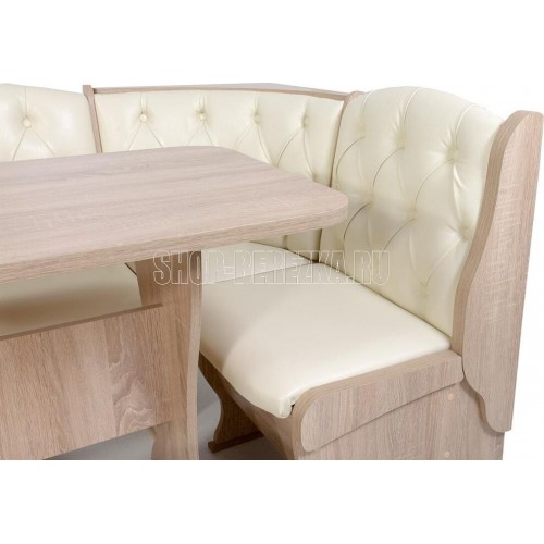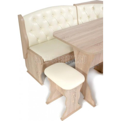 В комплект кухонного уголка Орхидея Люкс входит: стол обеденный со столешницей в цвет корпуса с термостойким покрытием. два табурета Тюльпан, кухонная скамья с размером 1100 мм на 1500 мм, с внутренними ящиками для хранения под сидением, декор мягкой части - каретная стяжка. Самый солидный вариант расцветки в экокоже - Барнео Умбер. Достойно смотрится на любой кухне, но особенно хорошо в классическом интерьере. Не требует тщательного ухода, практичен в уборке, достойно будут смотреться и в интерьере загородного дома. Размеры: скамья: 1500*1100*850 мм стол: 1000*580*750 мм табурет: 380*300*440 мм.