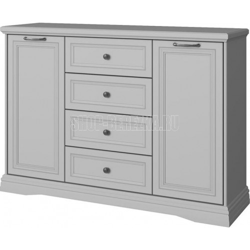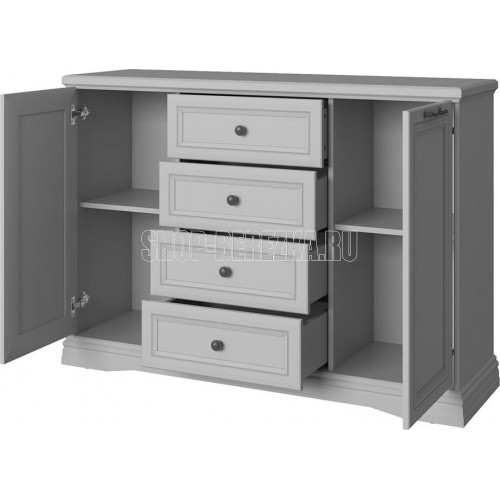 Двухдверная серая тумба с четырьмя вместительными ящиками украсит вашу гостиную или жилую комнату.