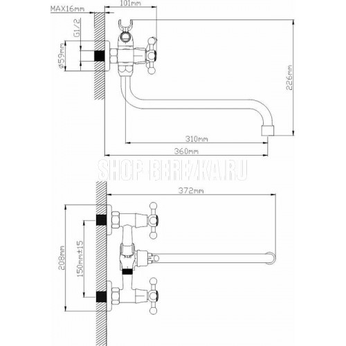 GR 123030 Смеситель д/ванны с 2-мя рукоятками с изливом S-30см. перекл.душа