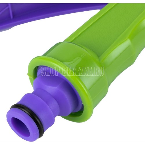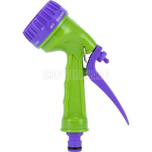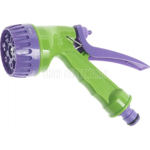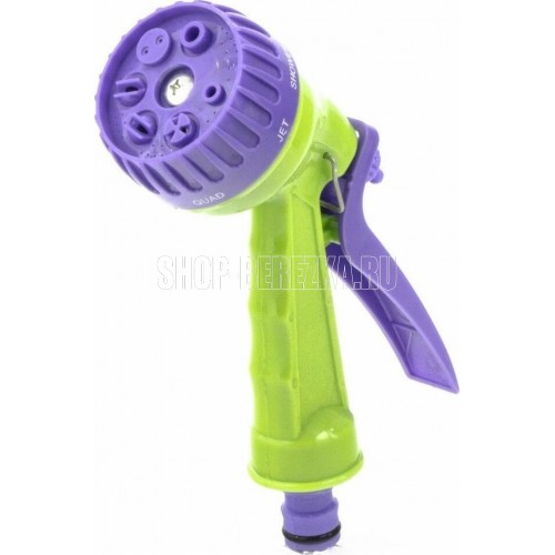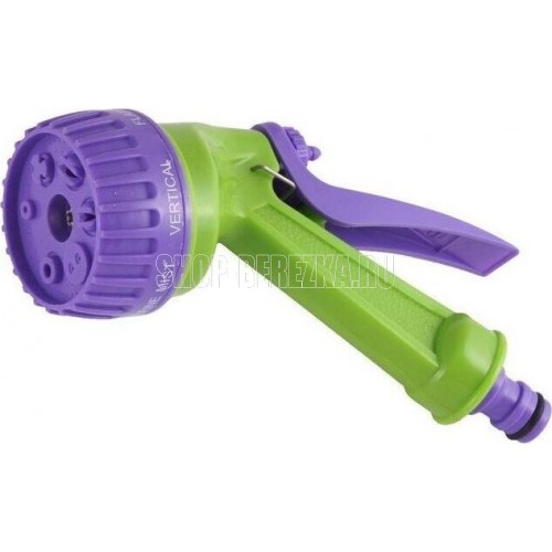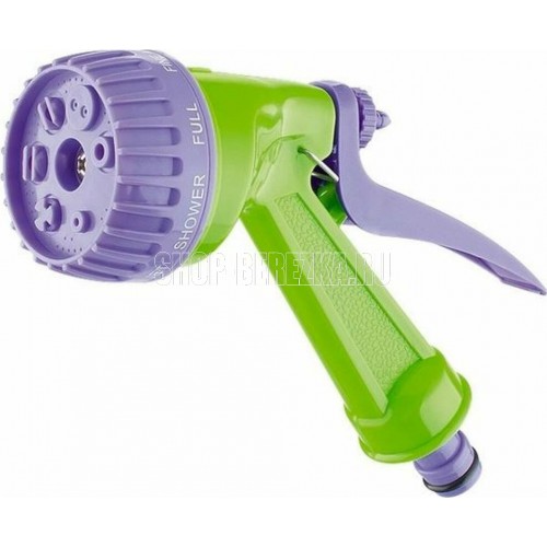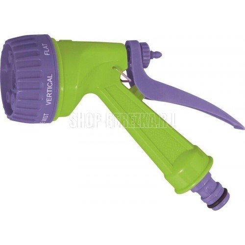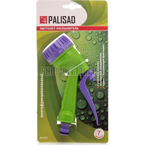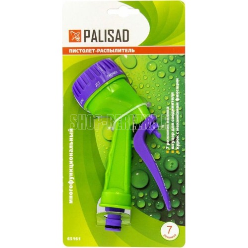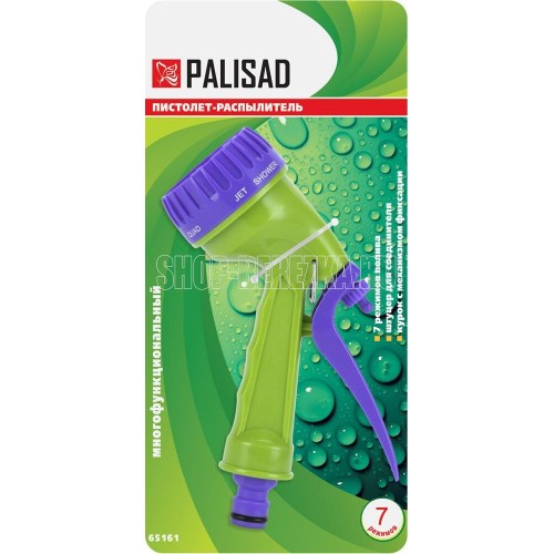 Пистолет-распылитель со штуцерной посадкой и курком, расположенным сзади. Оснащен регулируемой форсункой, что обеспечивает семь режимов полива: душ, режим задействования всех отверстий, мелкий туман, плоско-вертикальную струю, плоско-горизонтальную струю, туман, жесткую струя. Имеет фиксатор курка для непрерывной работы. Предназначен для всех типов полива на дачных участках, в садах, парках и скверах, а также для очистки. Совместим со всеми элементами системы полива Palisad и Palisad Luxe. Корпус, рукоятка и курок пистолета изготовлены из прочного АБС-пластика.