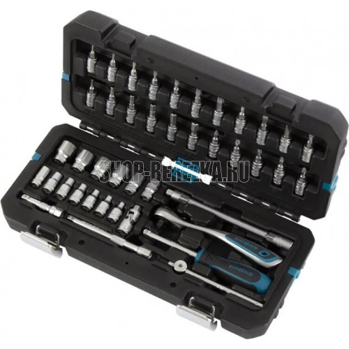 Набор инструментов Gross 14146 включает 42 предмета, в том числе ключ-трещотку из стали CrV со 120 зубьями, с присоединительным размером 1/4". Предназначен для монтажа и демонтажа резьбовых соединений, используется для ремонта автомобилей в гараже или условиях автосервиса. Кардан, вороток и совместимые с гаечным ключом удлинители облегчают работу с труднодоступными крепежами.ПреимуществаПрочность и долговечность — биты изготовлены из японской легированной стали S2, остальные инструменты выполнены из хромованадиевой стали.Устойчивость к нагрузкам — трещотка имеет цельнокованый корпус и выдерживает работу со значительным усилием.Надежный захват — насечки на битах, торцевых головках и удлинителях препятствуют их проскальзыванию даже в замасленных руках.Быстрый переход от монтажа к демонтажу — ключ-трещотка имеет переключатель реверса, позволяющий мгновенно менять направление вращения.Комфортная и эффективная работа — трещоточный механизм имеет 120 зубьев и обладает исключительной плавностью хода, шаг трещотки составляет всего 3°.Удобное хранение и транспортировка — комплект упакован в кейс из ударопрочного пластика с надежными металлическими замками, все инструменты надежно зафиксированы в ложементе.