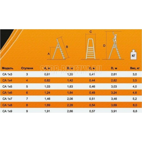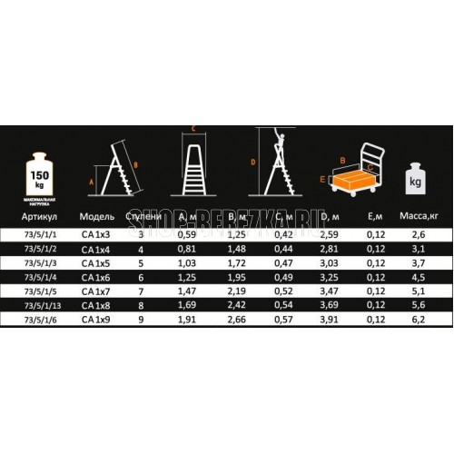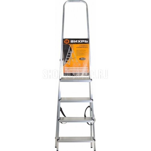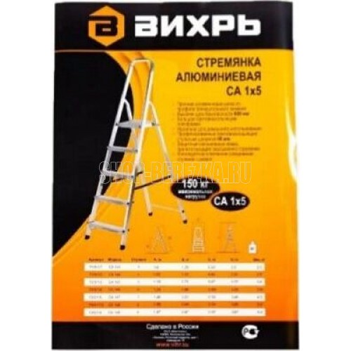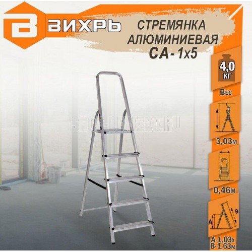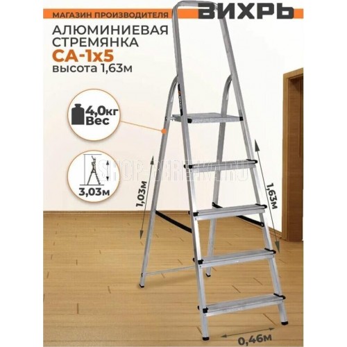 Алюминиевая стремянка Вихрь СА 1х5 73/5/1/3 пригодится в любой ситуации. Изготовлена из алюминия, что гарантирует высокую прочность и долговечность. Ступени с рифленой поверхностью не позволят скользить во время работы стоящему на них человеку. Прочные страховочные ленты предотвращают выход стремянки из рабочего положения. Высота площадки, м 1,03. Размер в сложенном состоянии, см 172х47. Количество ступеней, шт 5. Материал алюминий. Кол-во ступеней по одной стороне, шт 5. Max рабочая нагрузка, кг 150. Тип стремянка. Общая длина, м 1,72. min длина в сложенном состоянии, м 1.72. Широкие ступени да. Телескопическая/выдвижная нет. Ширина ступеней, мм 80. Ширина лестницы, мм 470. Лоток для принадлежностей нет. Анодированная нет. Вес нетто, кг 3,6. Габариты без упаковки, мм 1720х470. Толщина профиля, мм 0.8-1.