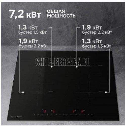 Стеклокерамическая варочная панель (индукция). 4 конфорки. Управление сенсорное. Общая мощность: 7200 Вт. Бустер на каждую зону нагрева. Инвертор. Индикация остаточного тепла. Блокировка клавиатуры. Защита от перегрева. Автоотключение при длительном использовании. Автоматическое определение размера посуды и регулировка мощности. Таймер на каждую зону. Габариты (ШхГхВ): 590*520*56 мм. Ниша для встраивания (ШхГхВ): 555*495 мм. Длина шнура питания 875 мм. Цвет: Черный