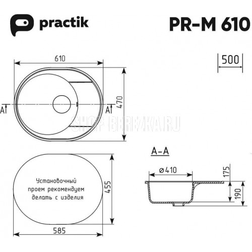 Овальная мойка Practik PR-M 610 с круглой чашей и плоским крылом отлично подходит для небольшой кухни. Мойка является реверсивной, то есть оборачиваемой - крыло может располагаться как справа, так и слева. Материал мойки представляет из себя искусственный камень, который является композитом на основе натурального мрамора и связующих смол. Искусственный камень существенно снижает уровень шума при падении струи воды. Специальное покрытие гелькоут защищает поверхность мойки от загрязнений и бытовых царапин, делая уход за мойкой легким и простым. Данная мойка имеет устанавливается в шкаф от 50 см и дает возможность осуществить монтаж мойки в стандартную столешницу шириной 60 см, а также открывает широкий спектр возможностей при проектировании кухни. Заводская гарантия составляет 1 год, а срок службы данной мойки, при соблюдении основных правил ухода за ней, составляет более 10 лет.