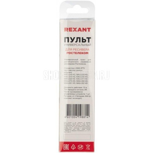 Универсальный пульт дистанционного управления REXANT для большинства современных моделей ресиверов Ростелеком, отличается простотой в использовании и высоким качеством. Пульт поддерживает все необходимые функции, обеспечивающие максимально полное и удобное управление ресивером. Имеет низкое энергопотребление, удобен и прост в настройке. Совместим с MAG IPTV приставками данных моделей: MAG-245 HD MAG-250 HD MAG-254 HD MAG-255 HD MAG-260 HD MAG-270 HD MAG-275 HD MAG-350 HD MAG-351 HD MAG-352 HD Размер пульта: 17.5х4.5х2.0 см Тип питания: батарейки 2 х ААА (в комплект не входят)