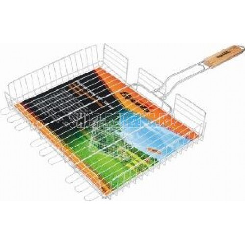 Решетка-гриль 300х400х65 мм, объемная хромированная. Конструкция объемной решетки-гриль позволяет фиксировать верхнюю плоскость на разной высоте, поэтому на решетке можно запекать продукты различной толщины — от стейков до куриных окорочков, не передавливая их и оставляя сочными. Высококачественная жаропрочная сталь. Эргономичная рукоятка. Широкое кольцо-фиксатор.