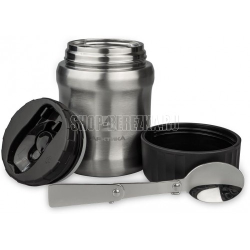 Термос для еды вакуумный, бытовой, тм «Арктика», 0.5 л, В комплект входит вместительная крышка-тарелка и складная ложка. Пробка оснащена кнопкой спуска избыточного давления в термосе. Самая легкая и компактная модель