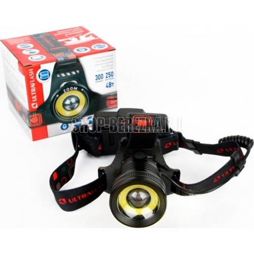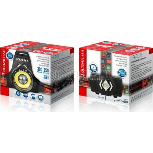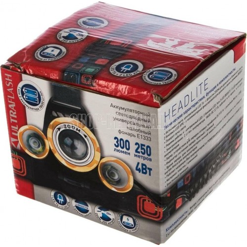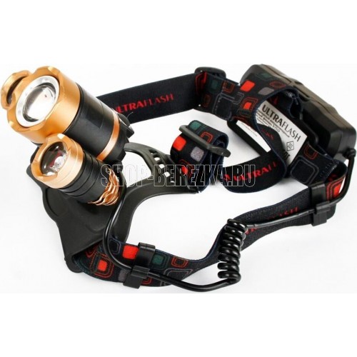 Фонарь Ultraflash электрический светодиодный налобный аккумуляторный. Цвет корпуса: золото / черный. Материал: корпуса фонаря - алюминиевый сплав / пластик. Источники света - светодиод XML-T6 с потребляемой номинальной мощностью 4 Вт, 2 светодиода XPE с потребляемой мощностью 3 Вт. световой поток до 300 люмен. Дистанция освещения - до 250 метров. Регулируемый фокус (ZOOM). 4 режима работы: XML-T6 / 2 боковых LED / все LED BOOST / мигалка. Возможность работы и от одного, и от двух аккумуляторов. Возможность работы напрямую от Powerbank через вход Micro USB. Индикатор заряда, меняющий цвет при окончании заряда. Выключатель: четырехпозиционный кнопочный. Время работы при полностью заряженном аккумуляторе (для емкости 1200 мА-ч): : в режиме XML-T6 - до 3,5 часов, в режиме 2 X XPE - до 5,8 часов, все LED - до 2,3 часов, мигающий режим - до 4 часов. Заряд через вход Micro USB. Время заряда (ток заряда 1А, аккумуляторы 1200 мА-ч) - 6 часов.