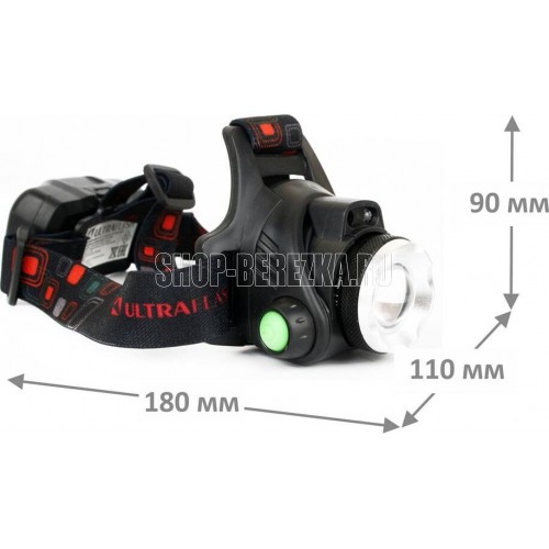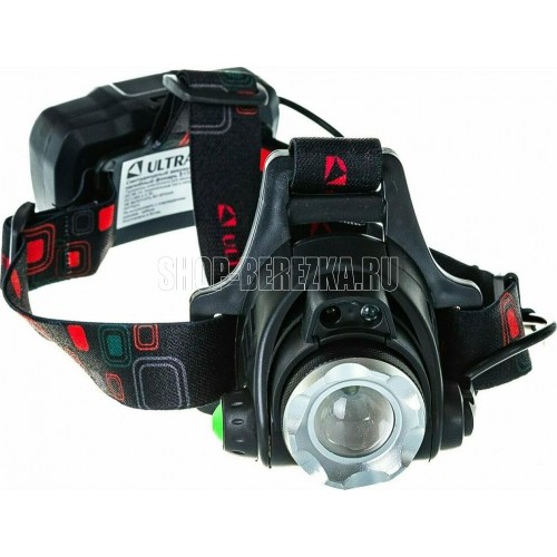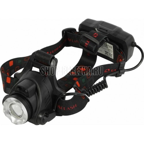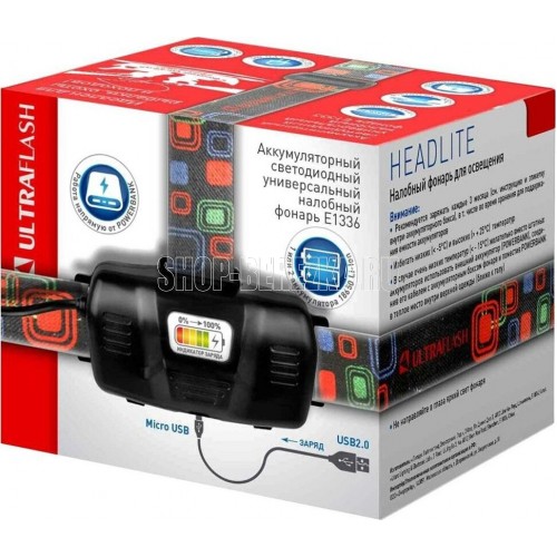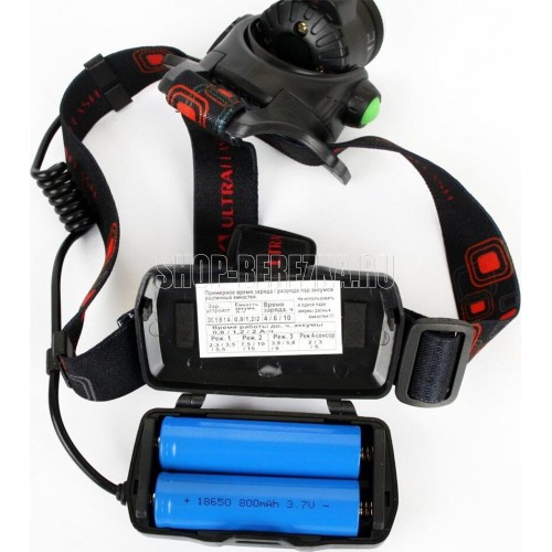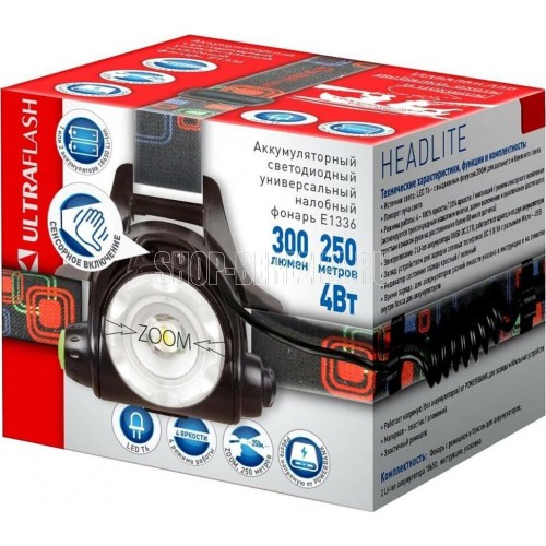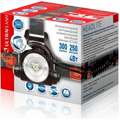 Фонарь Ultraflash электрический светодиодный налобный аккумуляторный. Цвет корпуса: черный. Материал: корпуса фонаря - алюминиевый сплав / пластик. Источник света - светодиод XML-T6 с потребляемой номинальной мощностью 4 Вт, световой поток до 300 люмен. Дистанция освещения - до 250 метров. Регулируемый фокус (ZOOM). 3 режима работы - 100% яркости / 30% яркости / мигалка. Возможность работы и от одного, и от двух аккумуляторов. Возможность работы напрямую от Powerbank через вход Micro USB. Индикатор заряда, меняющий цвет при окончании заряда. Выключатель: четырехпозиционный кнопочный. Режим работы, когда включение / выключение регулируется пироэлектрическим сеносром движения. Время работы при полностью заряженном аккумуляторе (для емкости 1200 мА-ч): : в режиме 100% - до 3,5 часов, в режиме 30% - до 10 часов, мигающий режим - до 5,8 часов. Заряд через вход Micro USB при помощи распространенных зарядных устройств для телефонов с Андроидом. Время заряда (ток заряда 1А, аккумуляторы 1200 мА-ч) - 6 часов. Комплект