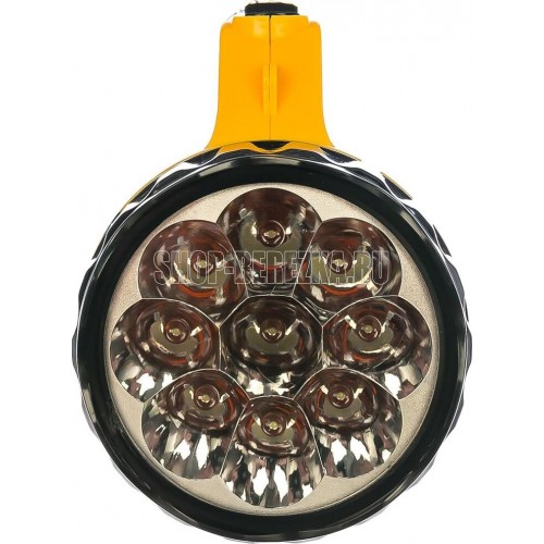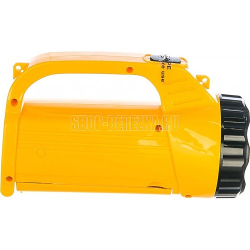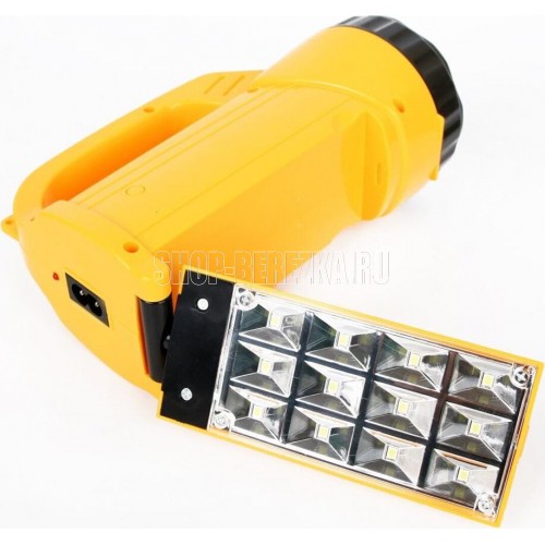 Фонарь электрический светодиодный аккумуляторный. Цвет корпуса: желтый + черный. Материал корпуса - пластик. Источник света - 9 светодиодов в индивидуальных отражателях со световым потоком 45 люмен - в отражателе, 12 светодиодов типа SMD - в поворотном плафоне. Дистанция освещения - до 25 метров. Два режима работы. Выключатель - тумблер двухпозиционный. Время работы при полностью заряженном аккумуляторе: 9 светодиодов в отражателе - до 3,5 часов, 12 светодиодов в плафоне - до 4 часов. Время заряда 12 ч. Степень пыле-влаго-защиты IP22.