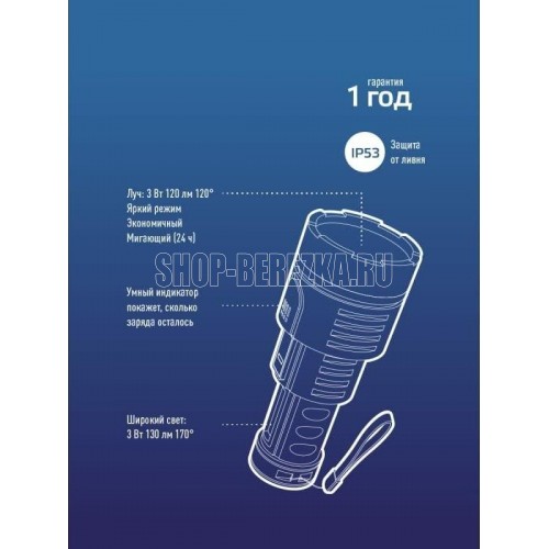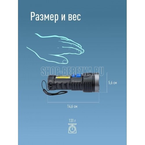 Аккумуляторный фонарь КОСМОС (KOS115Lit) с мощностью и свойствами прожектора в легком ручном корпусе. Умный индикатор показывает уровень заряда и во время подзарядки, и во время свечения. Совмещает луч фонаря (направленный свет) и широкий свет (освещает широкое пространство с одной стороны). Четыре режима работы: яркий, средний и мигающий у луча, и режим светильника. Литиевый аккумулятор. Источник света: мощный луч 3Вт LED; мощный боковой светильник 3Вт COB LED; Источник питания: Li-ion аккумулятор 18650 3,7В 1200 мА/ч (встроенный), индикатор уровня заряда, зарядный USB-шнур в комплекте; Количество режимов: 4 (яркий-экономичный-мигающий-боковой светильник); Световой поток: 120 лм. (луч)/130 лм. (широкий свет, боковой светильник); Дистанция освещения: 120 м. (луч)/17м2 (широкий свет, боковой светильник); Корпус: ABS-пластик (стилизация под металл); IP53; Размер: 14.6x5.6x5.6 см.; Ремешок ручной.