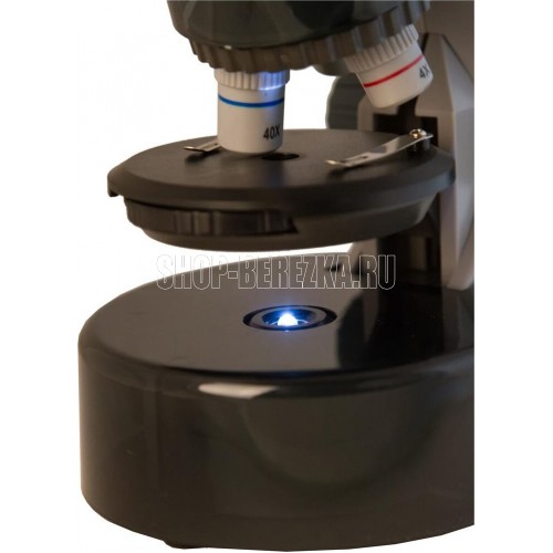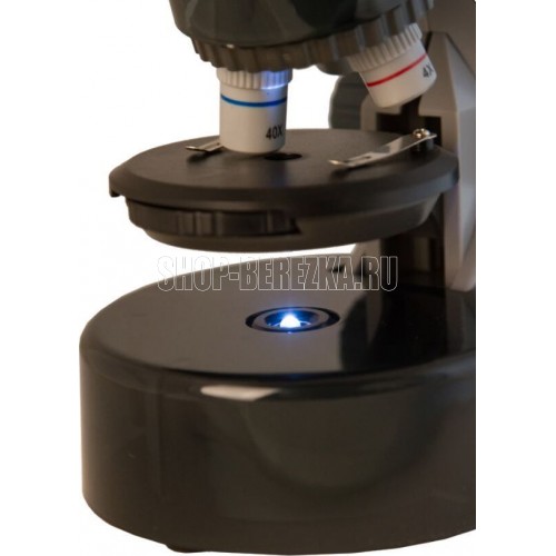 Тип микроскопа биологические. Тип насадки монокулярные. Материал оптики полимерное оптическое стекло. Угол наклона окулярной насадки 45°. Увеличение, крат 40–640. Диаметр окулярной трубки, мм 30. Окуляры WF10x–16x (двухпозиционный). Объективы 4x, 10x, 40x. Револьверное устройство на 3 объектива. Предметный столик, мм o82, с зажимами. Диапазон перемещения предметного столика, мм 0–15 по вертикали. Диафрагма диск с диафрагмами (6 отверстий). Фокусировка грубая. Корпус пластик. Подсветка светодиодная. Регулировка яркости есть. Питание от батареек 2 батарейки типа АА (нет в комплекте). Расположение подсветки нижняя. Метод исследования светлое поле. Набор для опытов в комплекте есть.