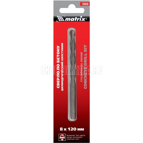 Сверло Matrix 70858 размером 8 х 120 мм, с цилиндрическим хвостовиком, устанавливается на дрель и используется для получения отверстий в бетоне, кирпиче, мраморе и других твердых материалах.