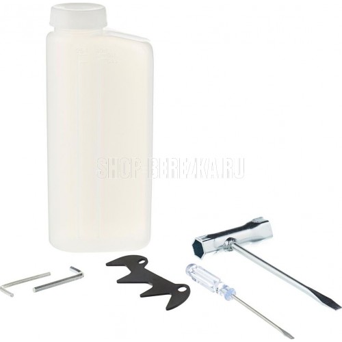 Комплект поставки шина, цепь, защитный кожух шины, емкость для смешивания топливной смеси
